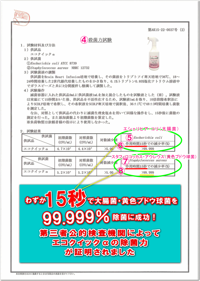 ■品名:エコクイックα ■消毒用エタノール同等濃度78%vol品!(食品添加物規格品) ■特徴: 1) メーカー直販だから出来る業務用速乾性アルコール除菌剤のこの価格! 2) 身の回りをすばやく除菌!まな板、包丁又はテーブル、椅子、手摺等に「シュッ」とスプレーするだけ! 3) インフルエンザ、O-157細菌等を強力除菌! 4) 30秒で99.999%除菌に成功!(第三者公的機関(社)日本油料検定協会にて殺菌試験実施済) 5) 主原料は100%植物由来サトウキビ、お酒(酒精)原料のため安心・安全! 6) エタノールの除菌・防腐効果を期待し食品に直接噴霧、浸透により日持ち向上剤としてもご使用頂けエタノール以外の添加物を最小限に留めているため風味などの影響も僅かです。